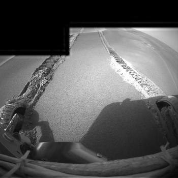 The amount of fill in the left wheel trench is greater than that in the right without any spill to the sides. Does this reflect : different volumes of material due to different densities before they were disturbed, deeper pentration by the right wheel below the surface, better traction on the left wheel moving more material forward as it backs out. or is there a larger pile of loose material in the way of the right wheel as it continues to back out? |