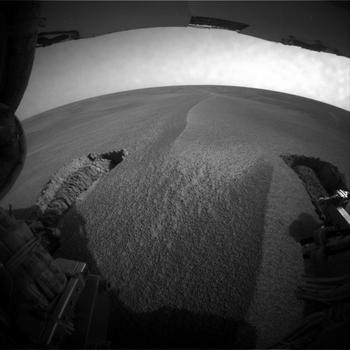Any changes in the strategy for driving the rover will depend upon what has caused its current problem. Several questions come to mind: What exactly caused the wheels to dig in? Did the front wheels dig in because the density of the surface material was so much less? Was the angle of attack and specific load on the wheel different in this approach than with other dunes that have been crossed? To what extent have conditions changed or was this the result of a bad combination of previous condition? Is this situation the result of unique conditions that can be avoided? If soil deposits are building up on the rover’s approach side of the dunes only we may be able to adjust the angle of approach to float lead wheels over the softer areas with less load on the approach wheel by varying the approach angle. Assuming that the windward side of the dunes have less low density topping, it may be possible to move parallel with the waves with greater confidence. Crossing over dunes would require more guidance from home. Do we have adequate mapping of the etched terrain to find a track through the maze that leads to the crater? |