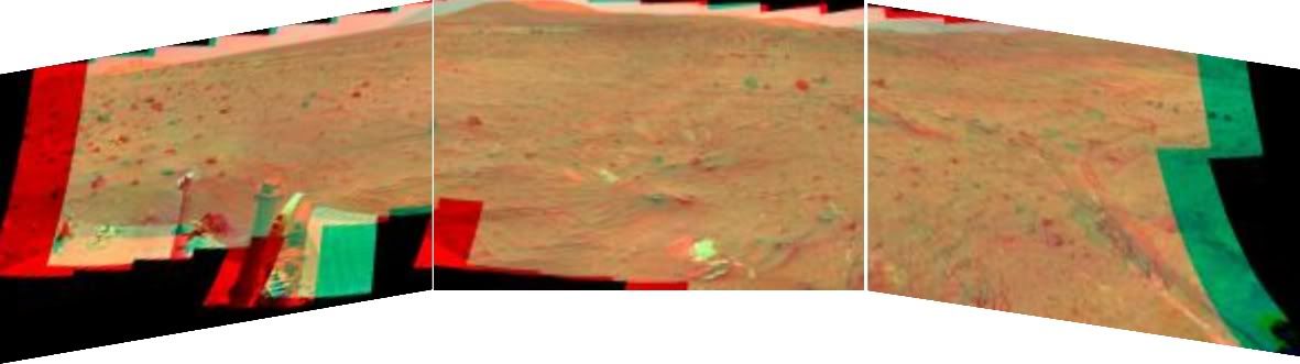 About the problems with seeing 3D with anaglyphs - as someone said, the pancam channels are too wide apart, but the real problem is with the way of generating the anaglyph. IMHO the read and blue channels should be aligned perfectly in the center of the image to make a good anaglyph. I have trouble seeing real 3d with some images posted here - I see double. But when I take those "bad" anaglyphs and do some rough align in photoshop, the results are unbelieveable - especialy with this color anaglyph from james (10x!) I think it varies from person to person, I made the colour anaglyph with the red and cyan channels aligned at the bottom as I find it really hard to see the near field in 3D otherwise. Maybe multiple versions are needed! James |