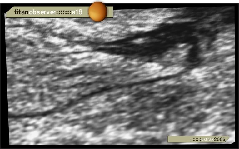 Titan lake Now, before anyone tells me off for my "playing about" and points out, rightly, that you can't just take these raw images and pull info out without a LOT of work, please bear in mind I KNOW all that, okay? Sticking my neck out here, to me it looks like the "drainage channel" on the lower right hand side actually continues into the "lake" for quite a way, maybe even flowing beneath an "island" of some sort. Other things look like they're in there too, but I'm just wondering if the "lake" is actually very shallow and we can see channels on its floor... Features? ...but heck, what do I know... |