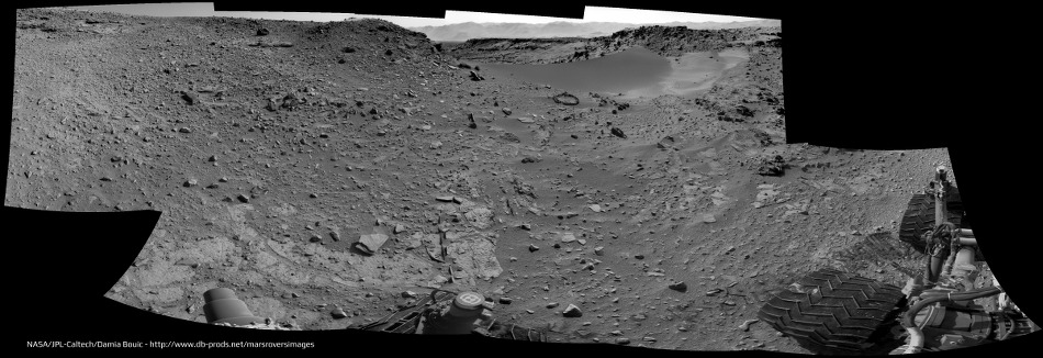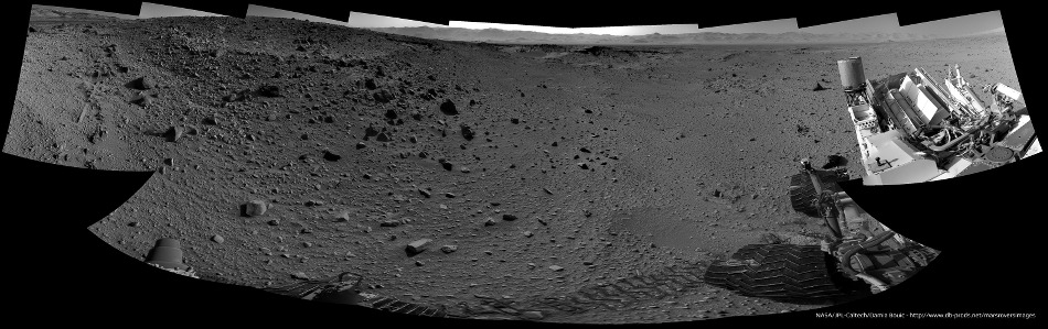 Sol 526 Navcam pan updated. The little story about this image is that the 4 images that complete the panoramic were taken on Mars at the exact moment I began to stitch the first part.