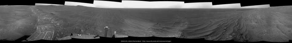 Hi Thanks a lot, Damia ! How nice ! ...and, Phil, jamescanvin and ngunn : -in theory- we would be able to discern from the very summit of Cape Tribulation a faint line lying on the north-western horizon showing Victoria Crater ! Herebelow as a reminder, Cape Tribulation as seen from the rim of Victoria Crater on Sol 986. Enjoy |